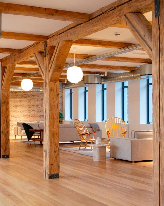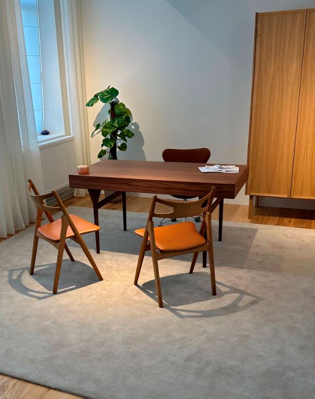 I det smukke vente- og loungeområde bydes klienter velkommen af Hans J. Wegners ikoniske Skalstol og den majestætiske Påfuglestol, som begge komplementerer rummets sjæl. Over dem svæver de klassiske Radiohuspendler på række og kaster et blødt og behageligt lys ned i det højloftede rum. Valget af møbler og belysning, der selv har en rig historie, skaber en naturlig dialog mellem indretningen og bygningens arkitektur.