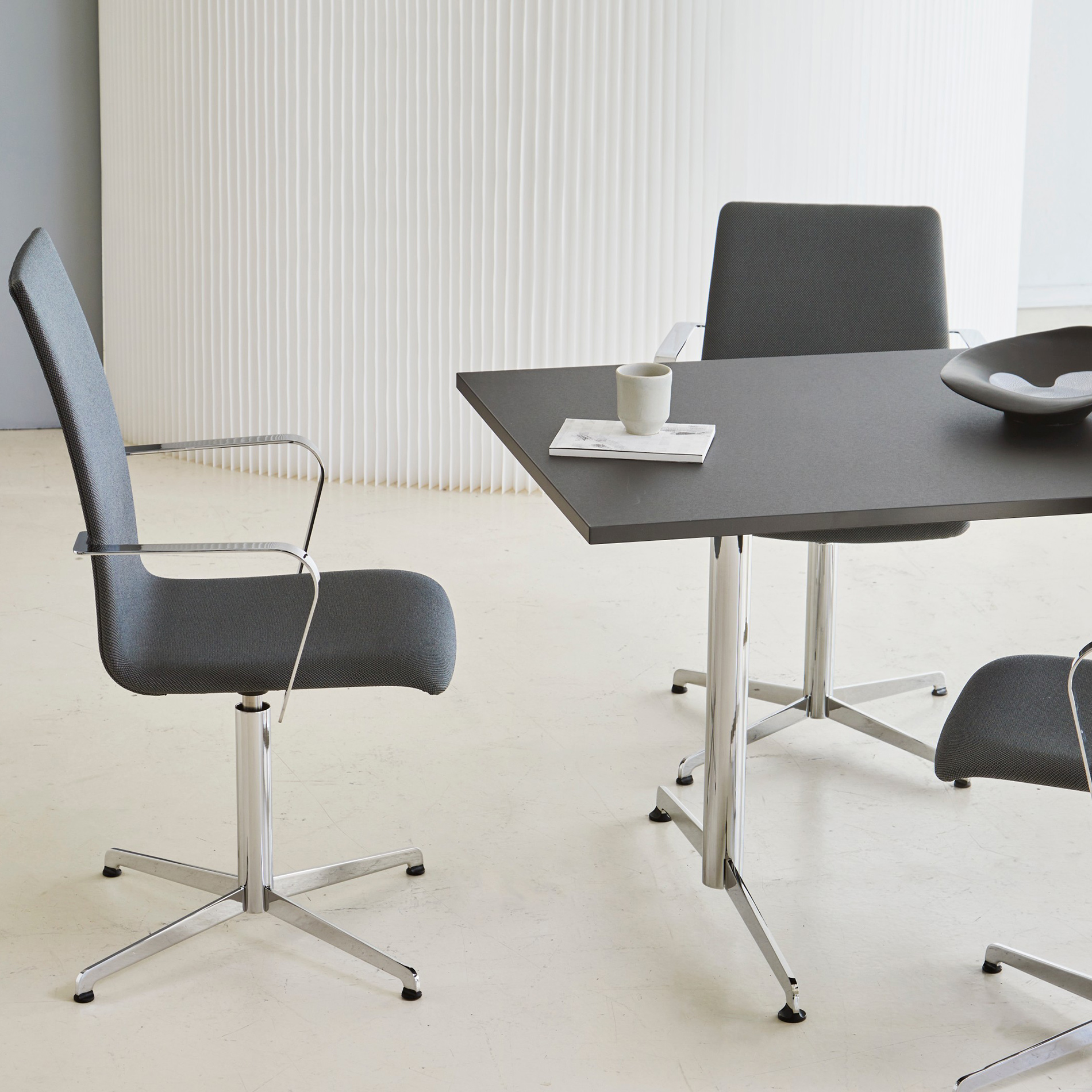 Gate serien af mødeborde er bygget op omkring et solidt T-ben shakerstel med en 4-benet søjle, som fås i enten klassisk krom eller moderne sortlakeret stål. Denne konstruktion sikrer en god stabilitet og giver samtidig bordet et let og elegant udtryk.