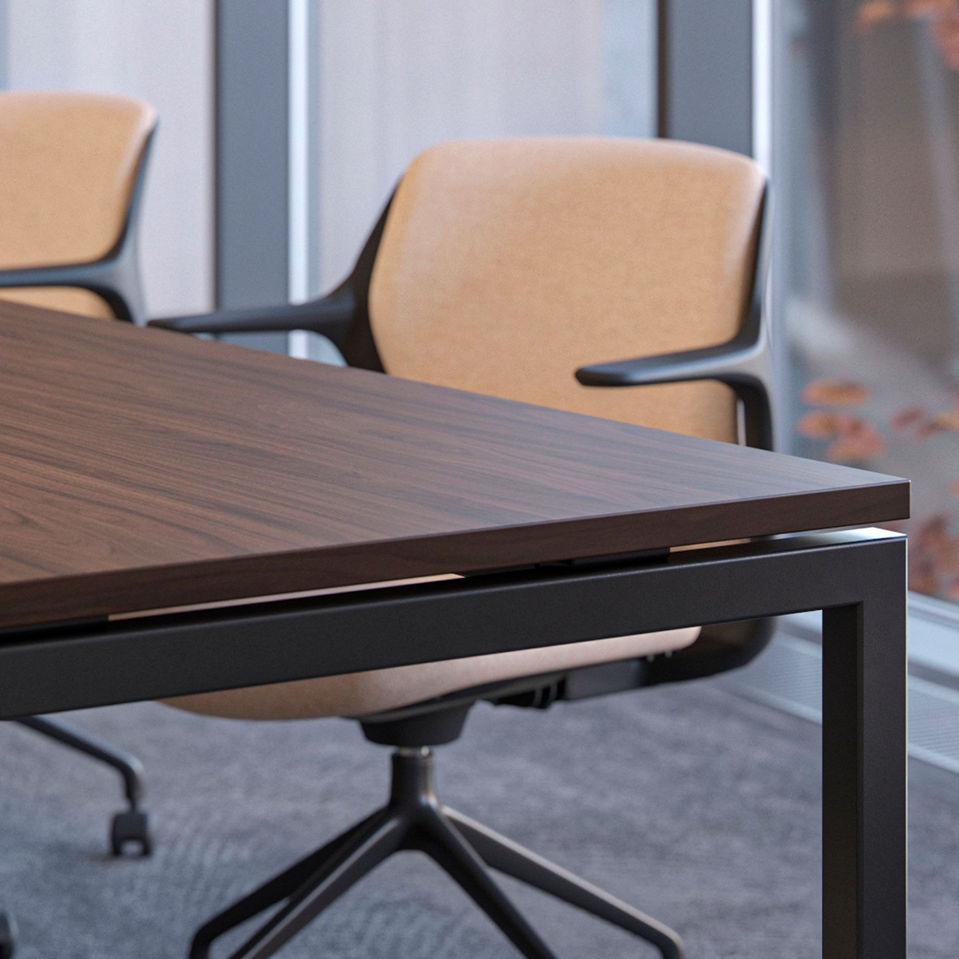 NOVA tilbyder et væld af tilpasningsmuligheder. Vælg mellem et stort udvalg af materialer og farver til bordpladen, herunder slidstærk MFC (melamin) og elegant finér. Metalrammen og benene kan leveres i seks forskellige standardfarver, så bordet kan matches perfekt til den øvrige indretning. Den solide "metal-til-metal" konstruktion og de pulverlakerede stålben med justerbare fødder sikrer et stabilt og holdbart møbel.