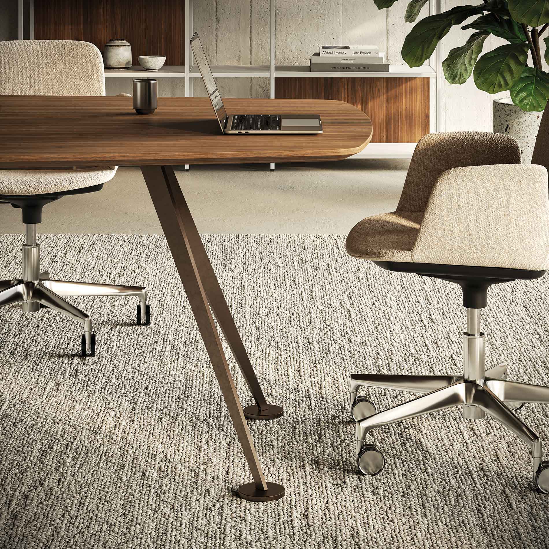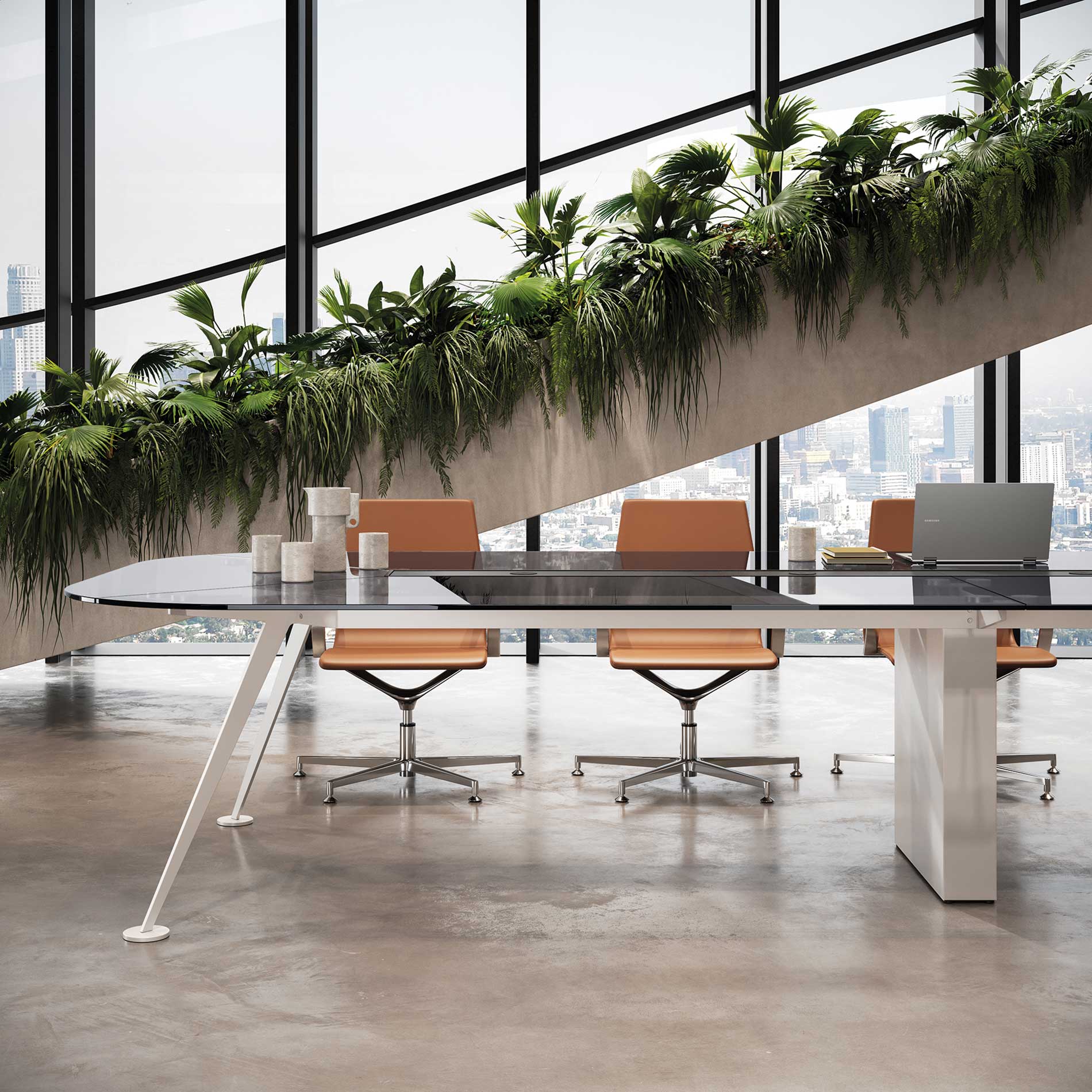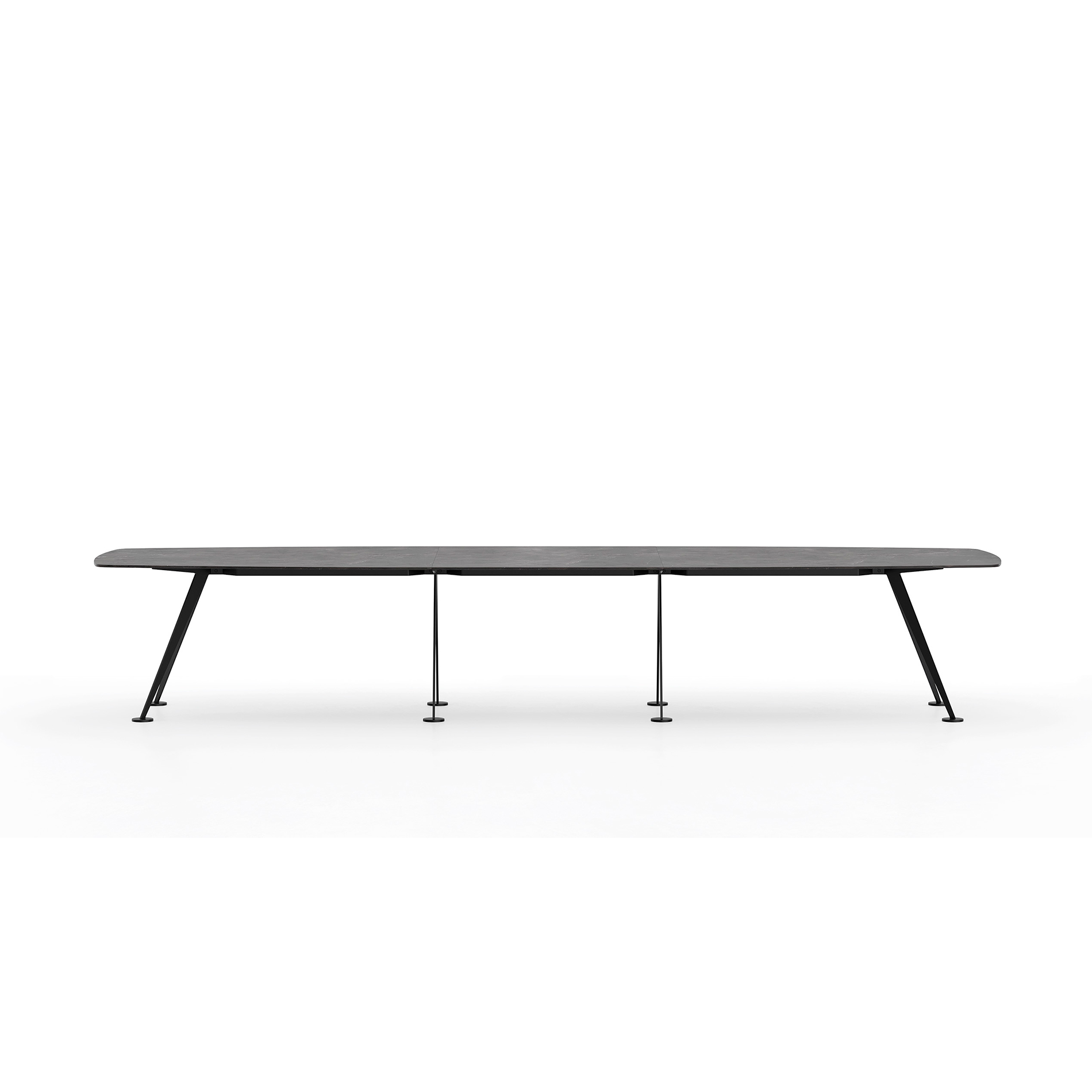 Det karakteristiske stel er udført i laserskåret stål med en elegant hældning på 30°, hvilket giver bordet et markant arkitektonisk udtryk. Samtidig sikrer konstruktionen høj stabilitet, også ved de største bordstørrelser. Bordpladen kan vælges i flere materialer, så mødebordet kan tilpasses forskellige typer indretning, fra klassiske møderum til moderne kontormiljøer.