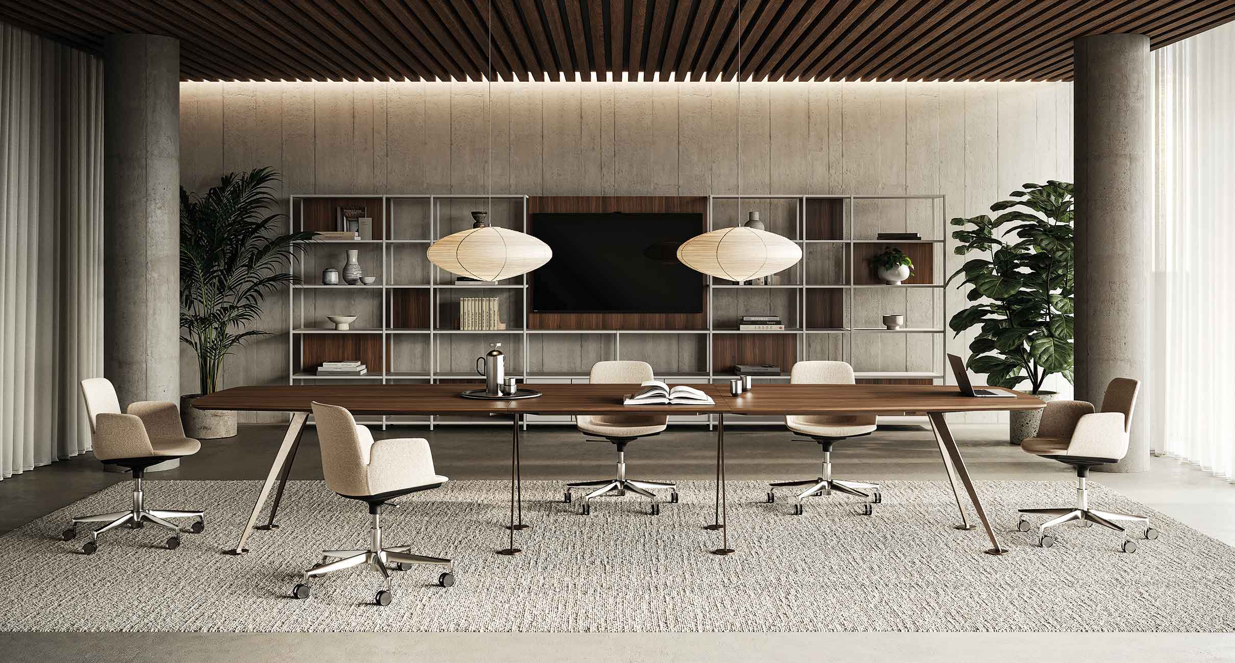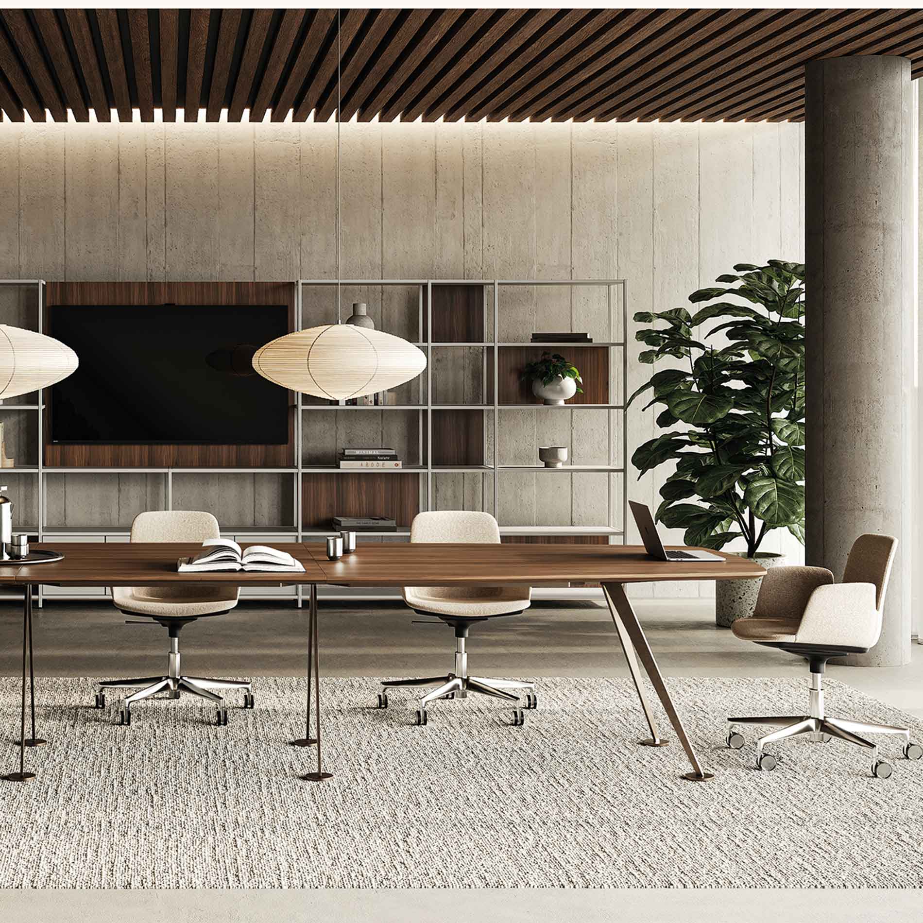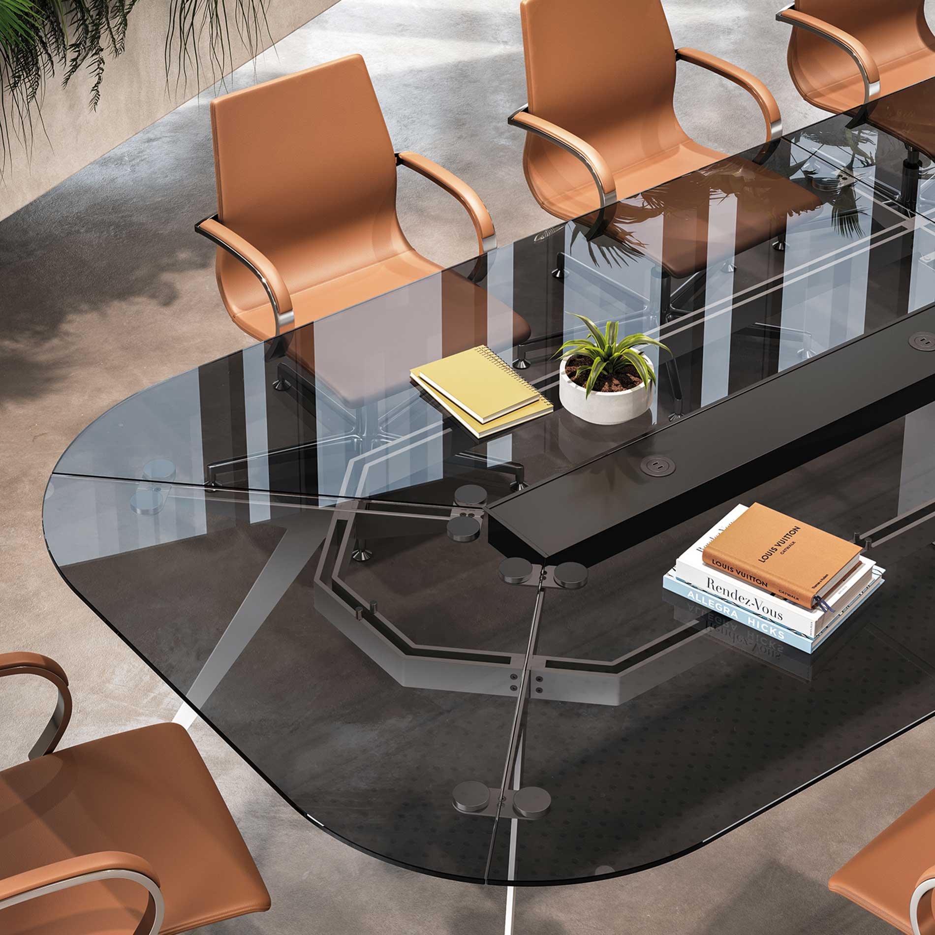 Det karakteristiske stel er udført i laserskåret stål med en elegant hældning på 30°, hvilket giver bordet et markant arkitektonisk udtryk. Samtidig sikrer konstruktionen høj stabilitet, også ved de største bordstørrelser. Bordpladen kan vælges i flere materialer, så mødebordet kan tilpasses forskellige typer indretning, fra klassiske møderum til moderne kontormiljøer.