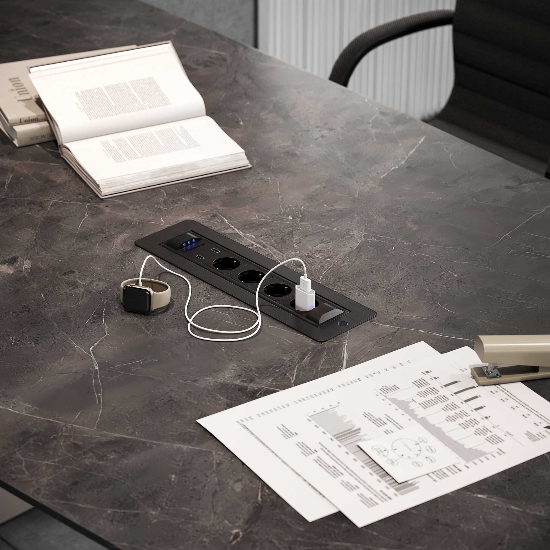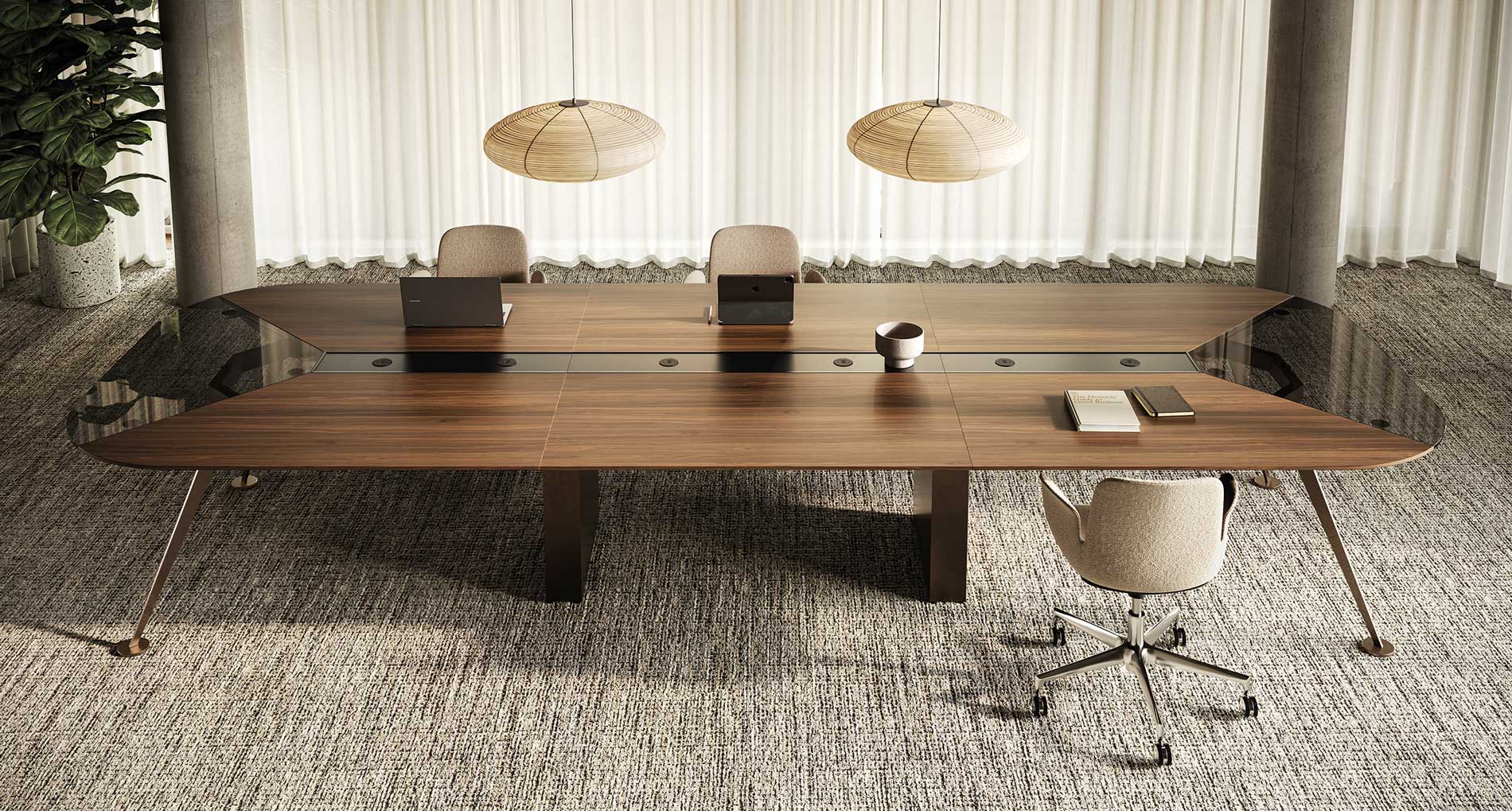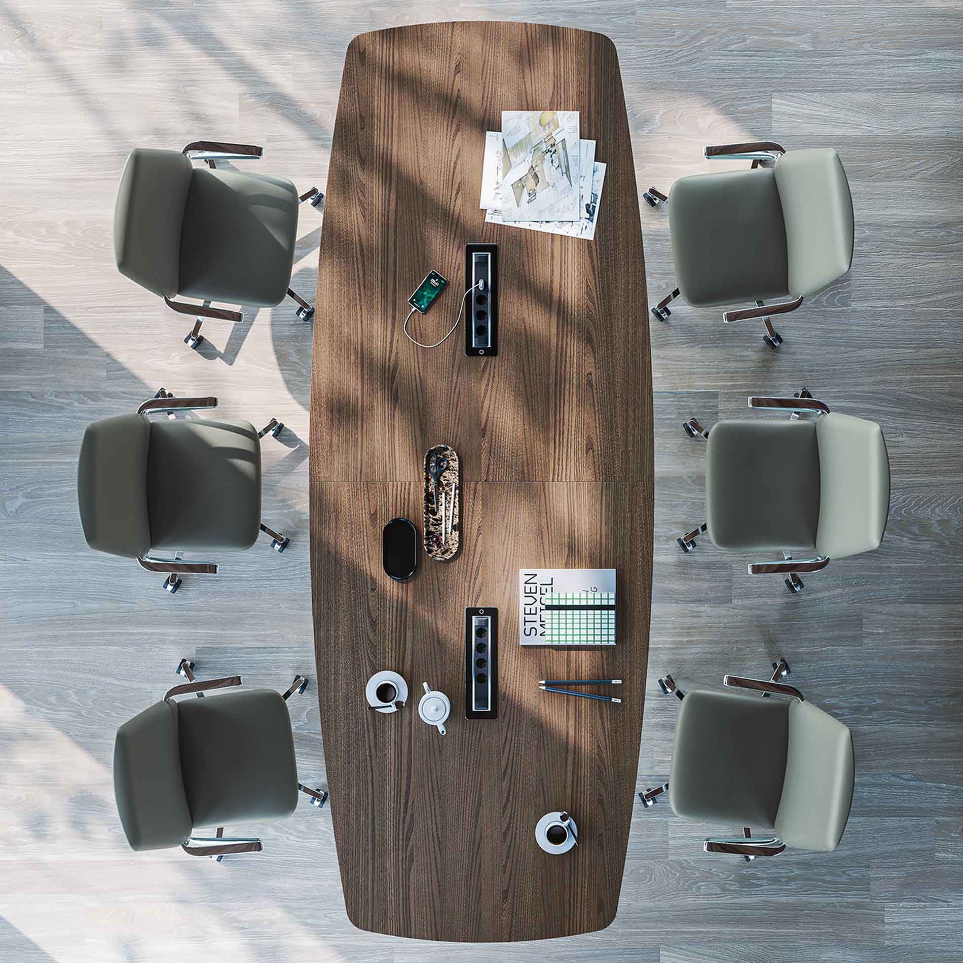 Bordene kan desuden konfigureres med top access og integreret kabelstyring, så strøm og tilslutninger kan skjules i bordet og holde mødebordet rent og stilrent i udtrykket.