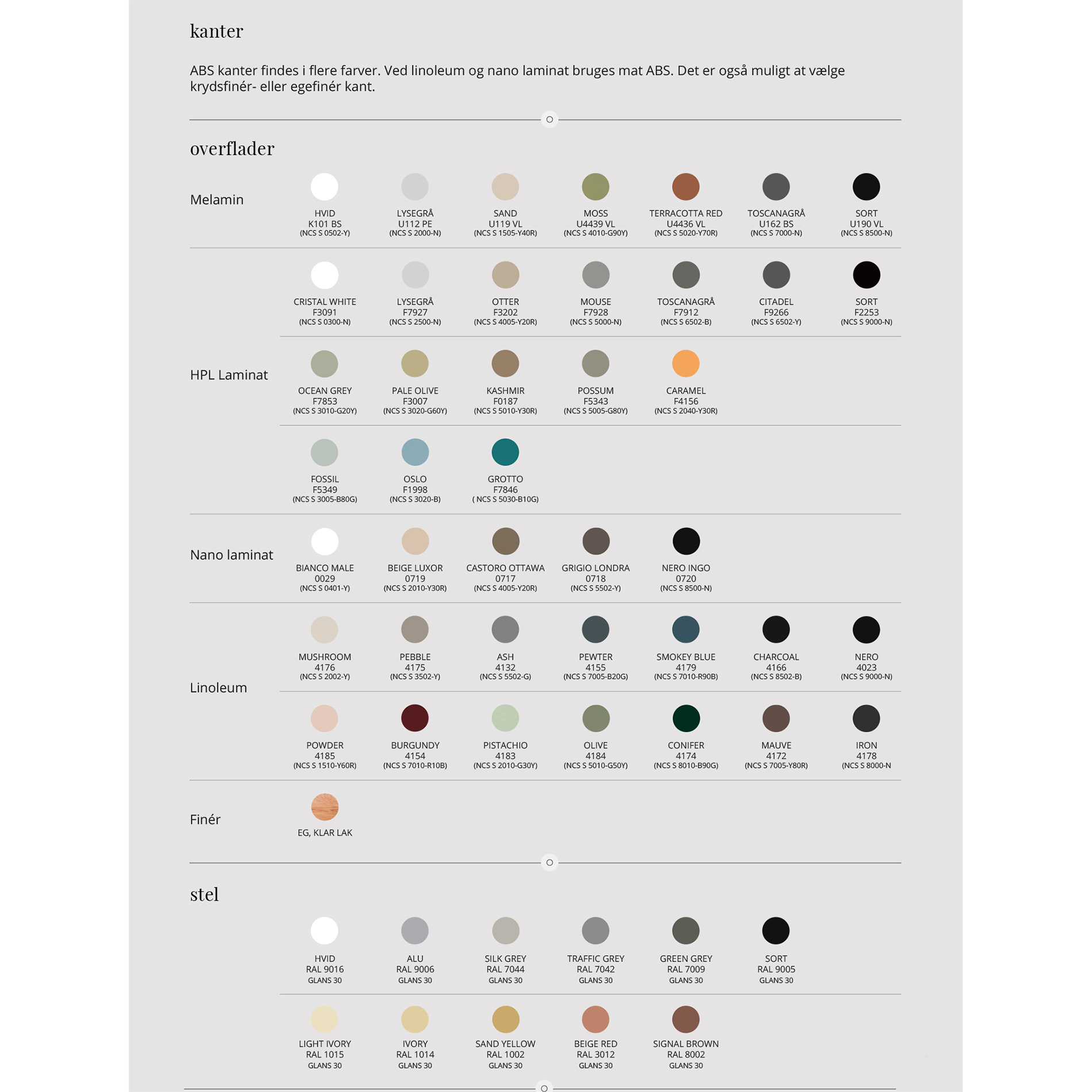 - Overflader: Stort udvalg af slidstærke overflader som Melamin, HPL laminat, Fenix nano-laminat og Forbo linoleum.