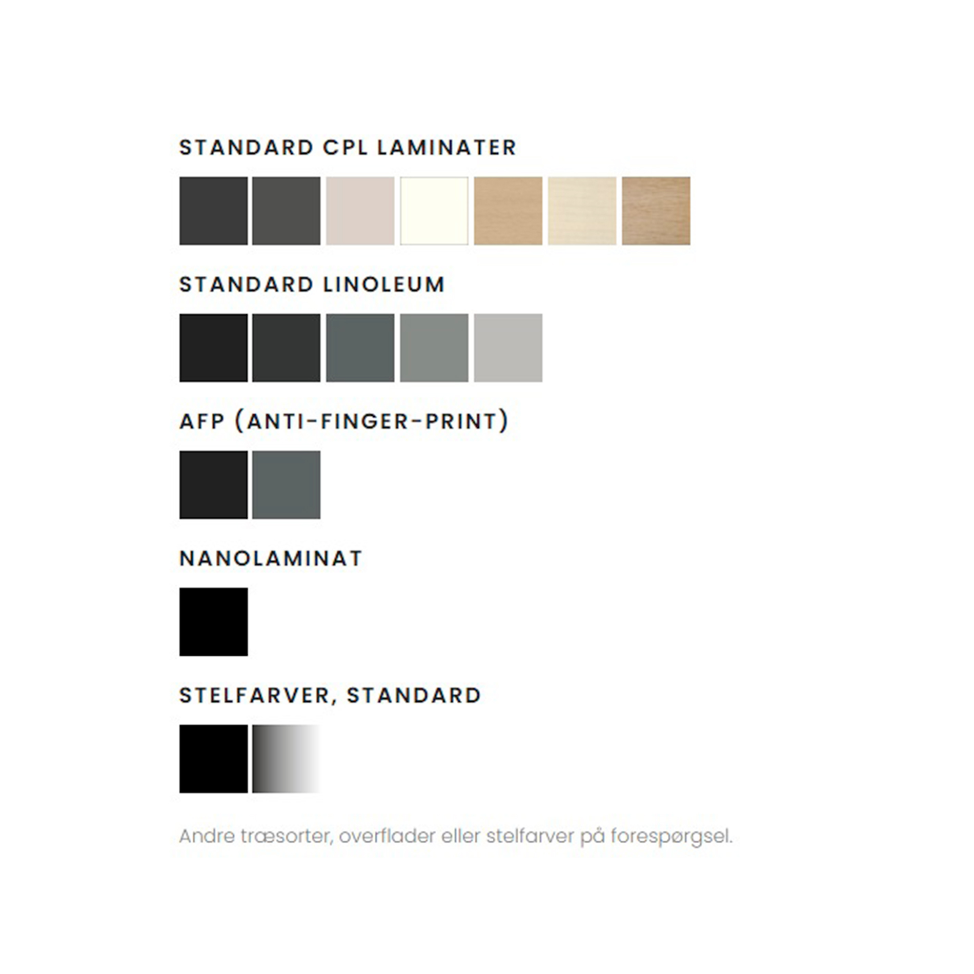Bordpladen med decor laminat er som standard en 22 mm spånplade med lige ABS-kant. Bordpladen med CPL laminat er som standard en 22 mm plade med lige ABS eller faset kant. Standard stel: sort
