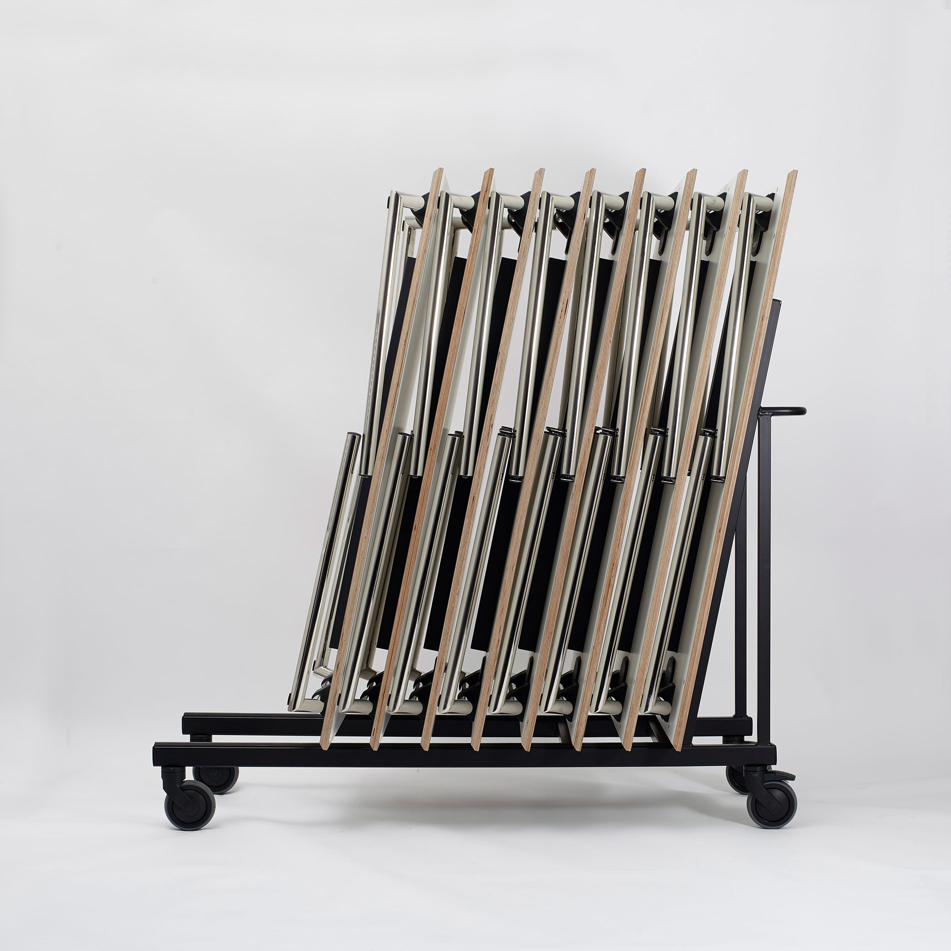 CONCEPT foldebordet er designet med fokus på lethed og ergonomisk håndtering med mulighed for integrerede hjul, således at sammenfoldning og stabling på transportvogn er nemt. 22 mm bordplade i enten Decor laminat, CPL laminat, finer eller linoleum (se standard farver her). 4-benet stel i sortlakeret stål el. krom. Stoleophæng kan tilvælges.