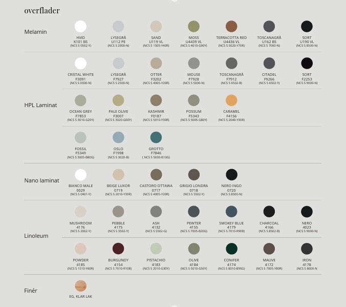 Overflader: Melamin, HPL laminat, Fenix nano-laminat, Forbo linoleum.