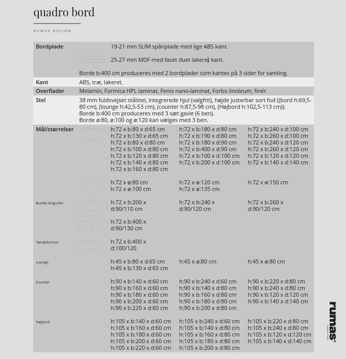Quadro-serien af møde- og konferenceborde fra Rumas er indbegrebet af klassisk, skandinavisk design, hvor funktionalitet og æstetik går op i en højere enhed. Dette mødebord er bygget på det ikoniske og robuste Quadrostel, som sikrer en urokkelig stabilitet, selv ved store bordplader.