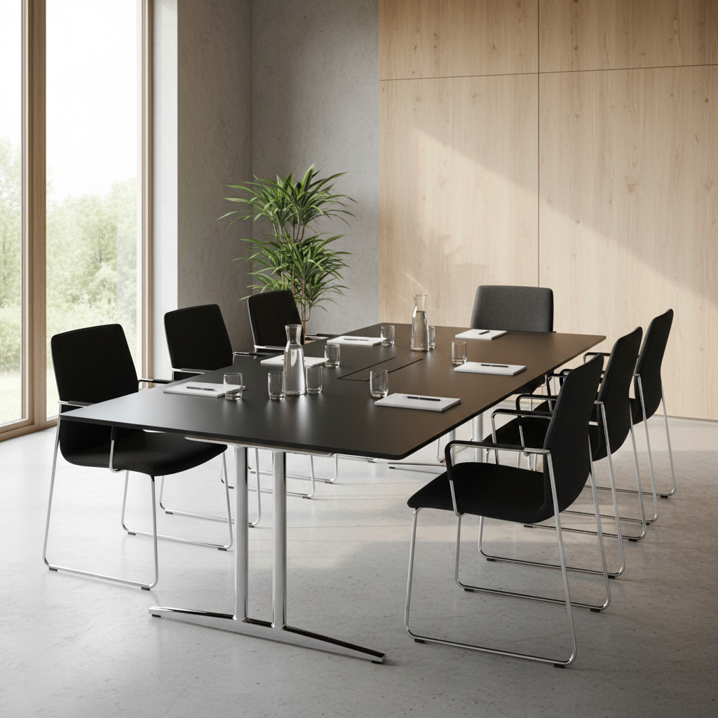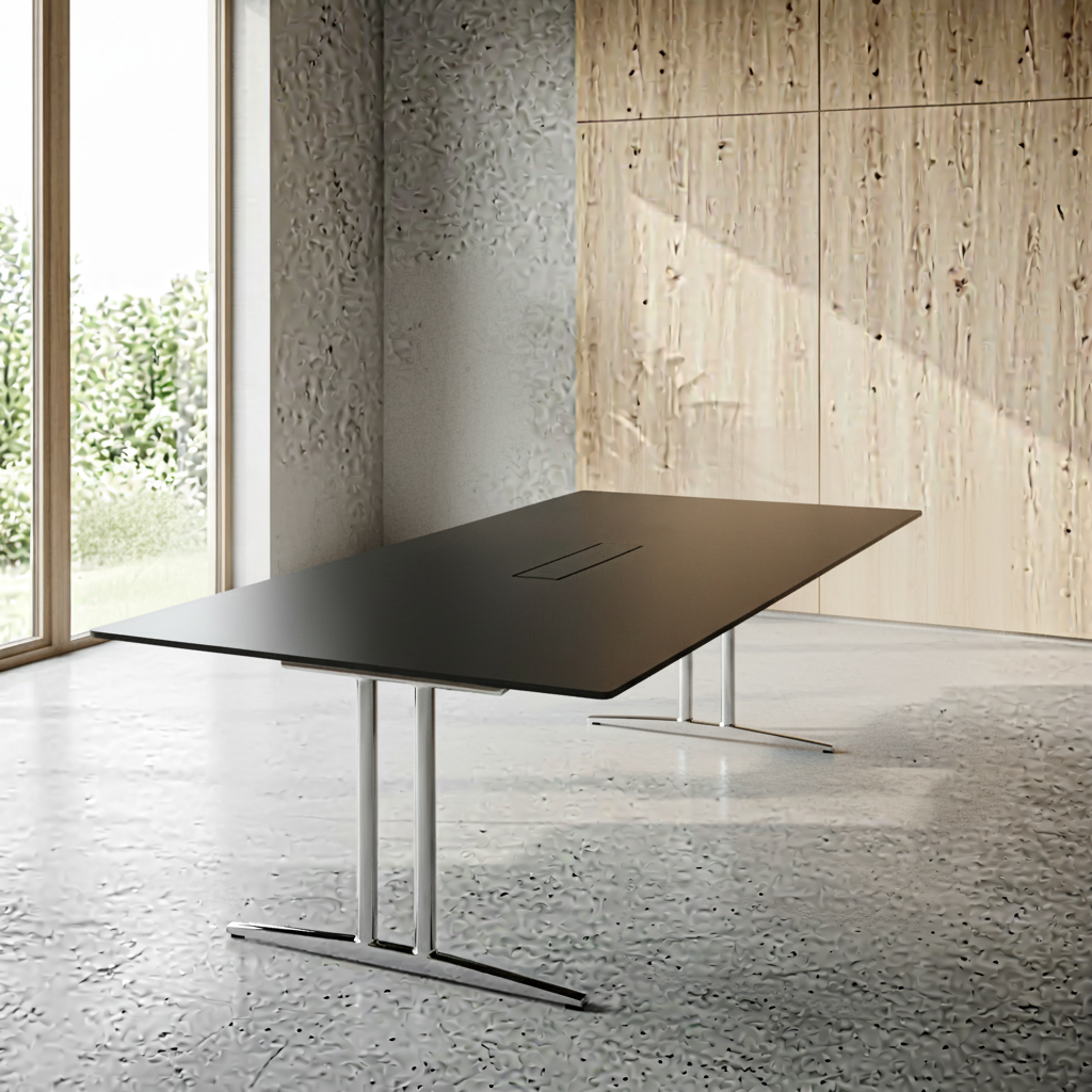 Møde- og konferencebordet forener funktion og æstetik i ét gennemført design, der passer perfekt ind i moderne møderum og professionelle kontormiljøer. Serien fås med enten bådformede eller rektangulære bordplader, hvilket giver dig frihed til at vælge den løsning, der bedst matcher rummets størrelse, mødeform og visuelle udtryk.