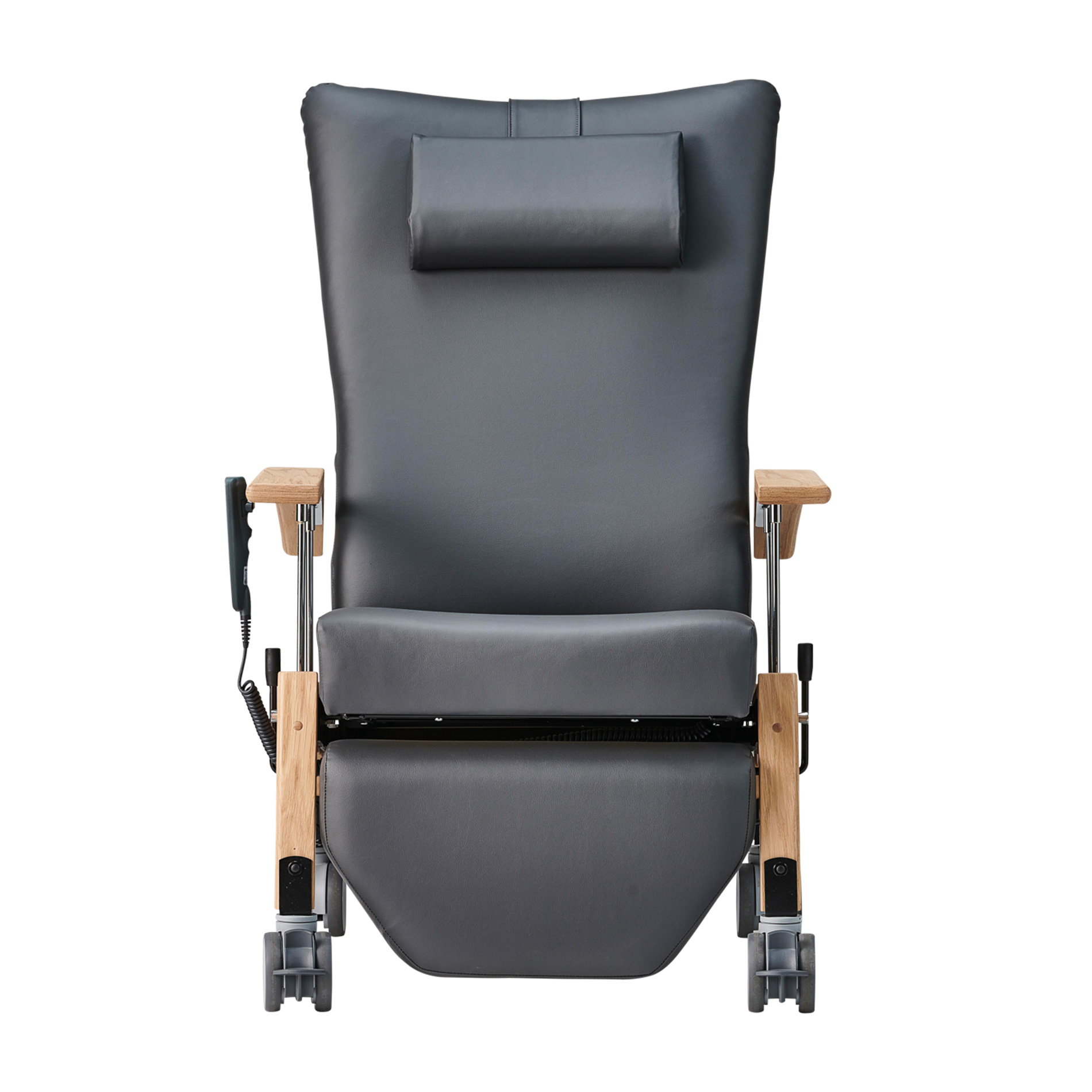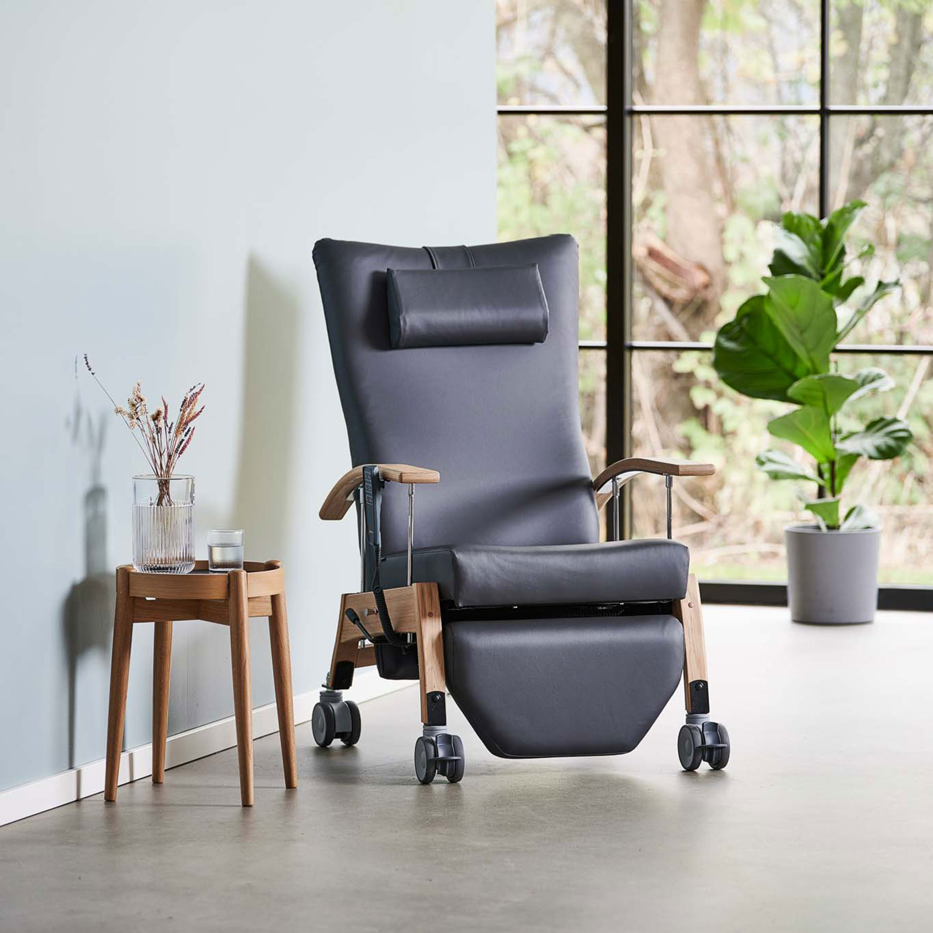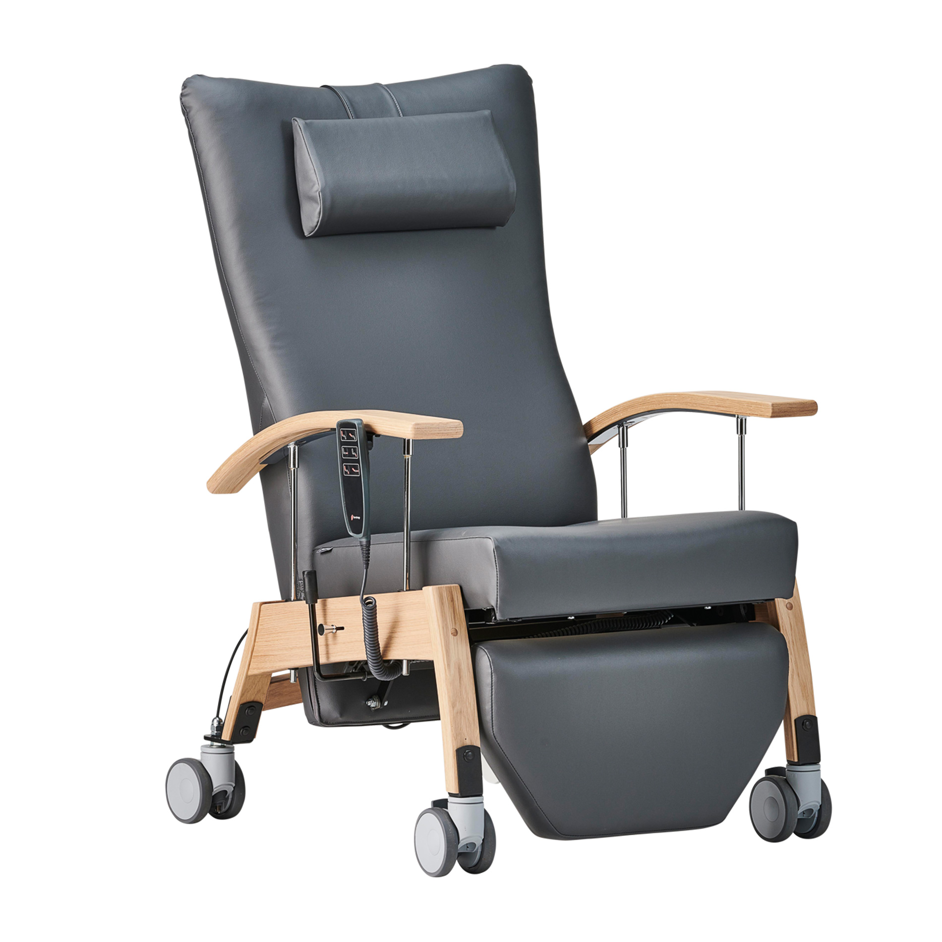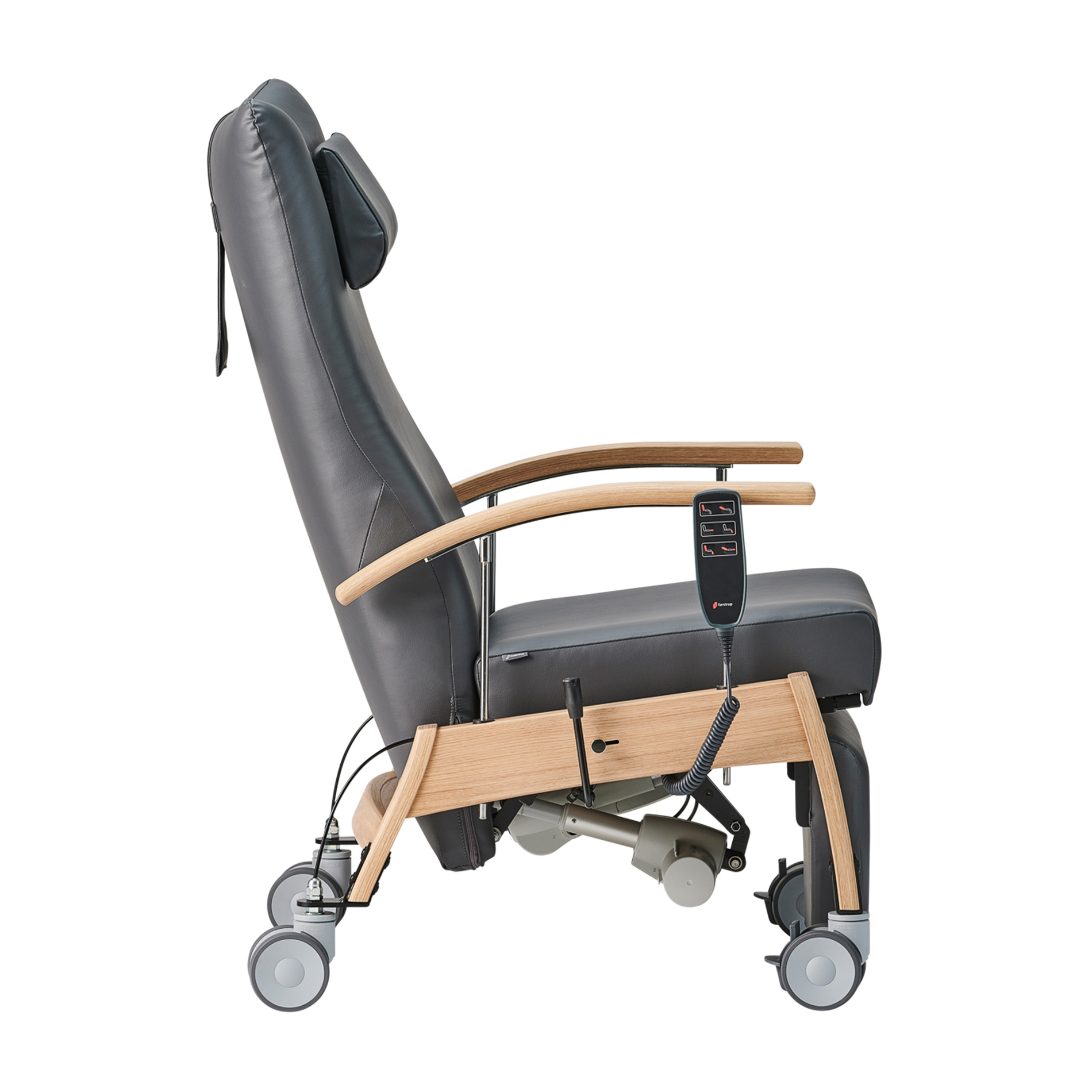 Stolen kan tilpasses individuelt i både mål, materialer og funktioner, herunder motorer, hjul og batteriløsninger, så den matcher specifikke behov i pleje- og omsorgsmiljøer.