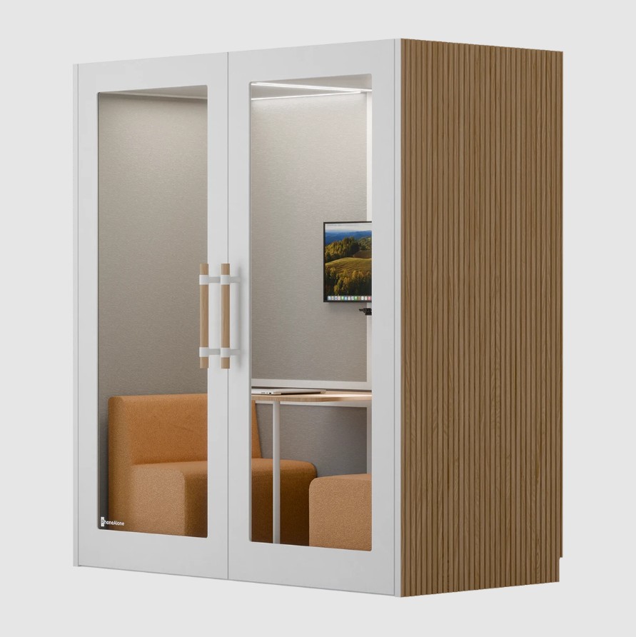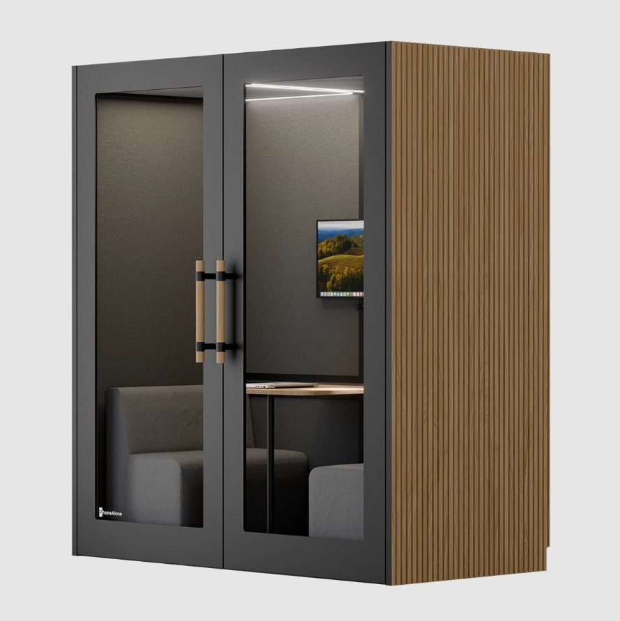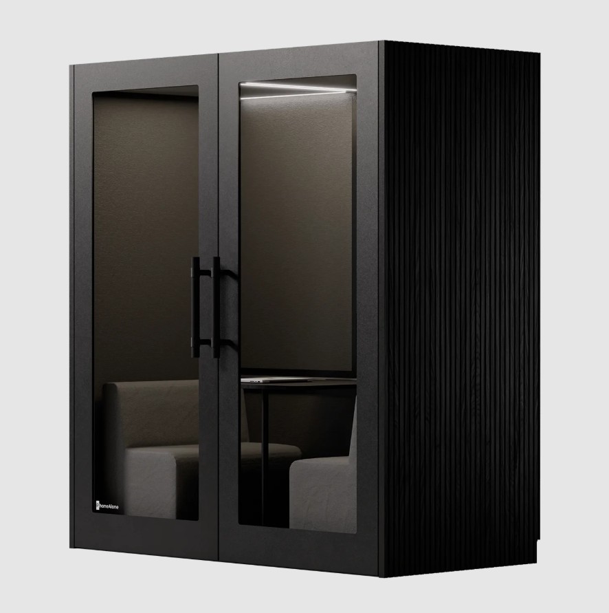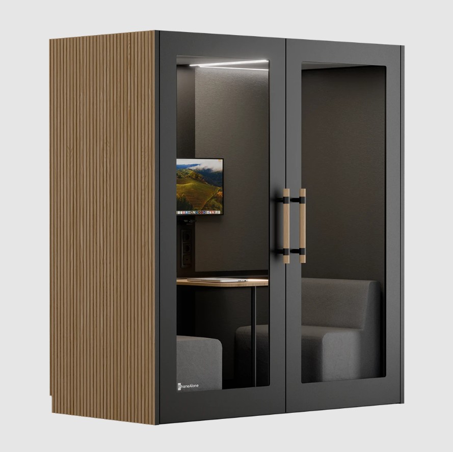 PhoneAlone Dobbeltboks er den ideelle løsning til virksomheder, der ønsker at skabe stille zoner til møder, samarbejde og fordybelse i åbne kontormiljøer. Boksen er designet til op til to personer og giver et afskærmet rum, hvor man kan arbejde koncentreret eller afholde uforstyrrede samtaler.