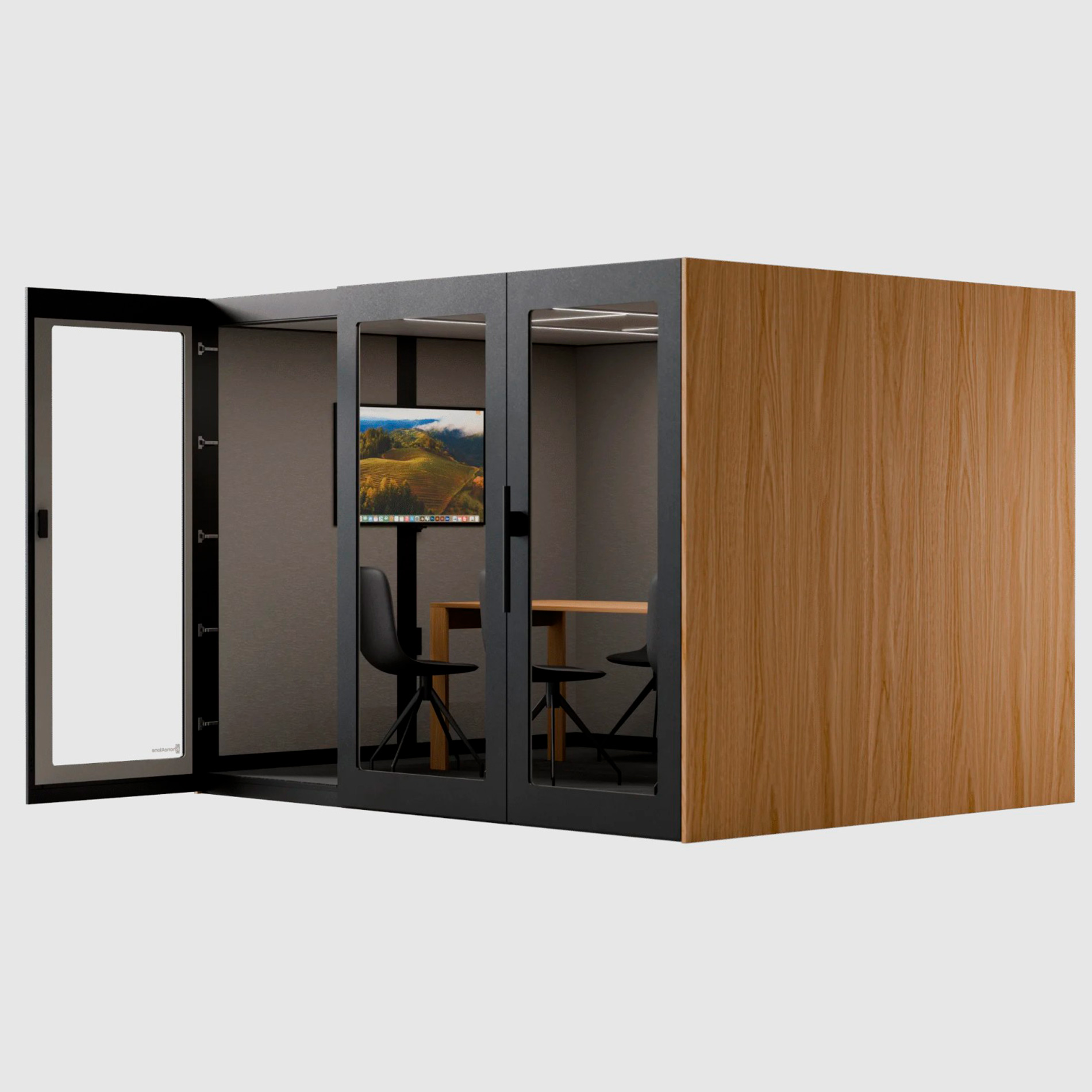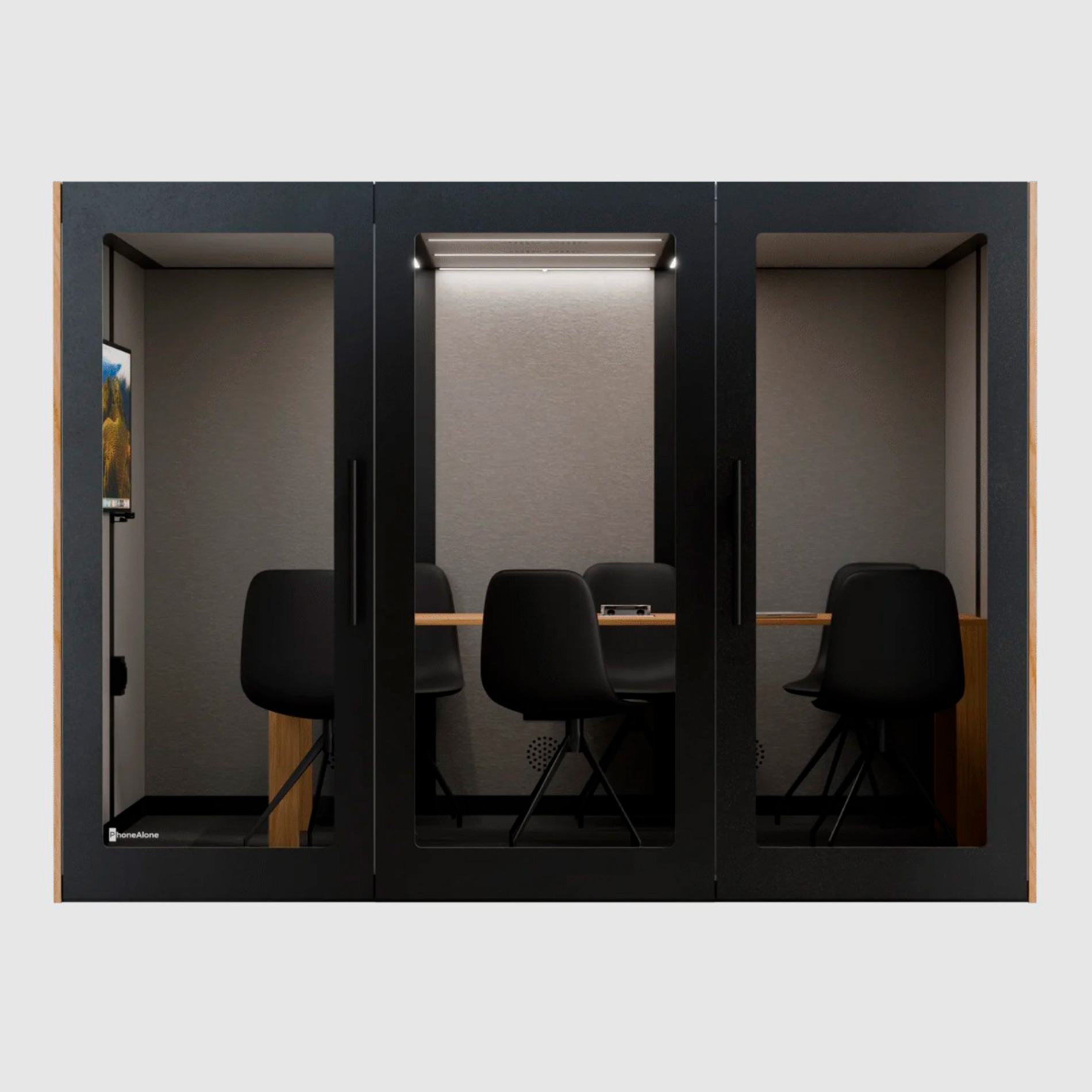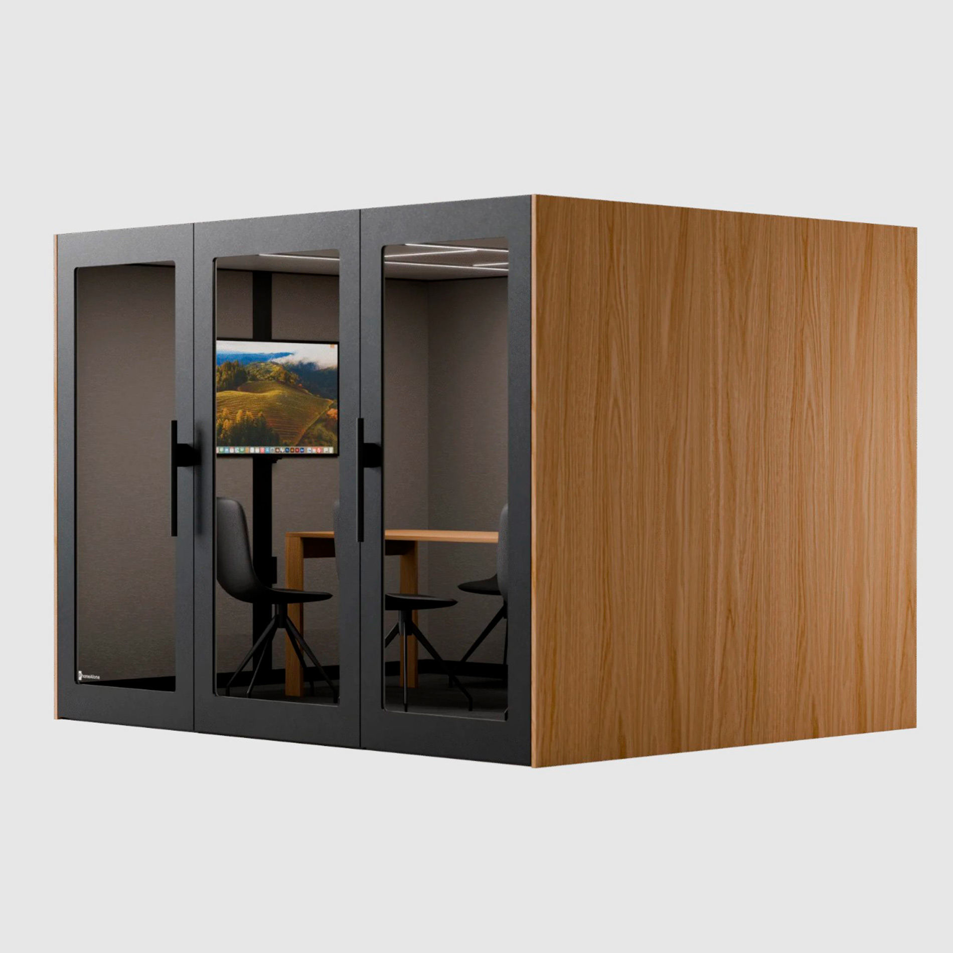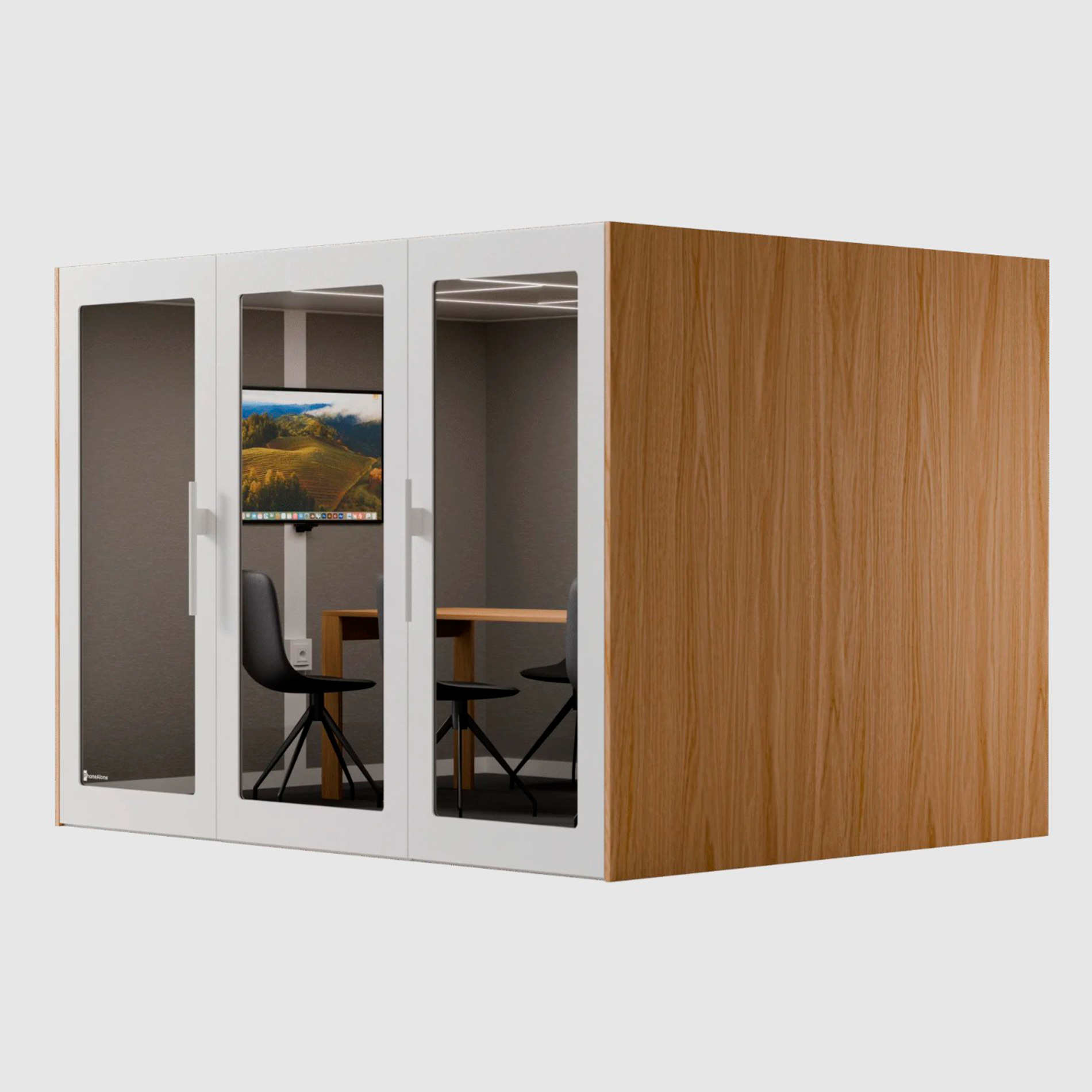 PhoneAlone Konferenceboks er en rummelig, lydisoleret mødeboks til 6-8 personer, ideel til møder, workshops og samarbejde i åbne kontormiljøer. Med en lyddæmpning på min. 30 dB, kraftig ventilation med 11 ventilatorer og integreret strøm er boksen skabt til effektivt teamwork og uforstyrrede møder. Mål: H:223,7xB:300xD:244,6 cm.
