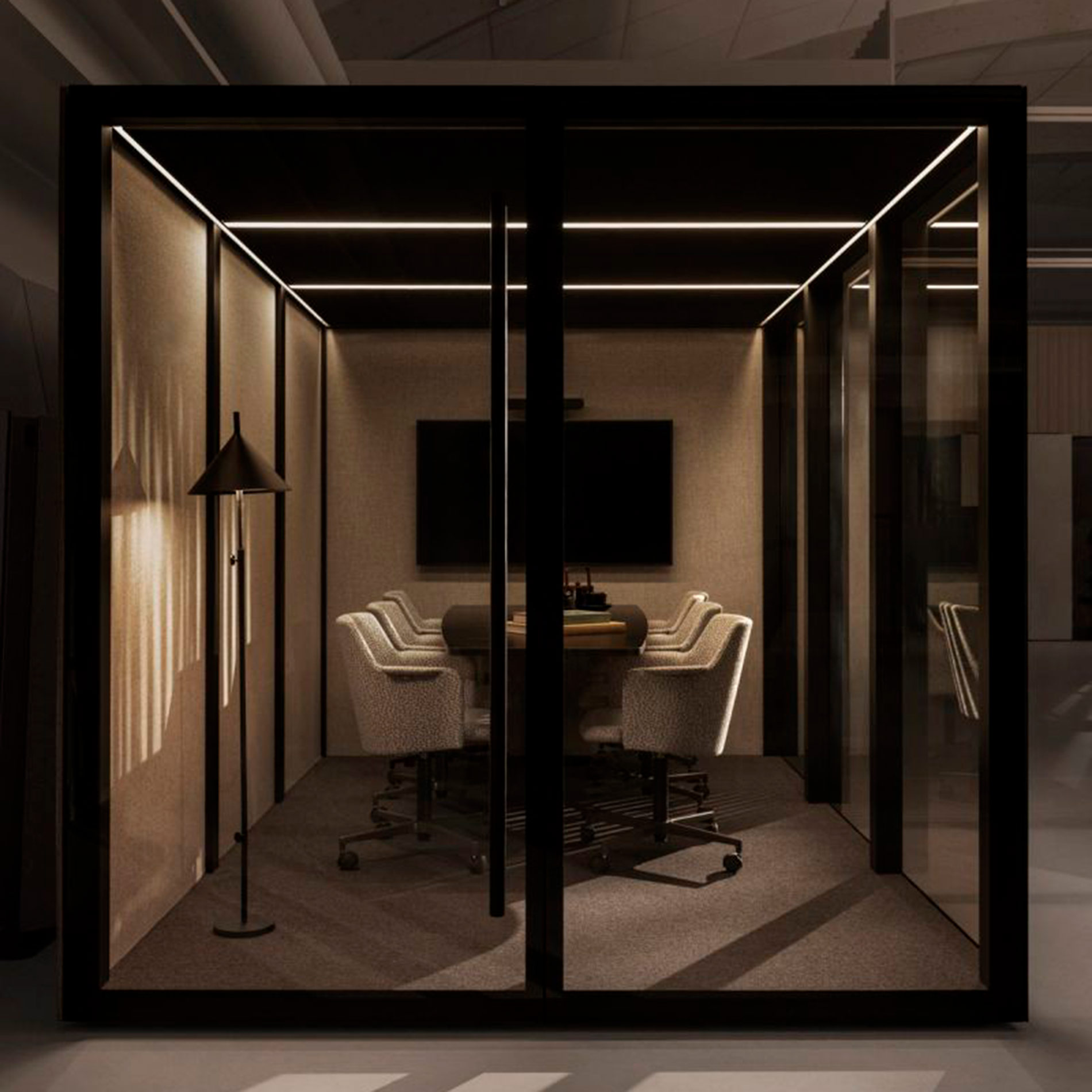 Zen Pod Large leveres som standard uden møbler, men kan udstyres med en conference møbelpakke, der indeholder: