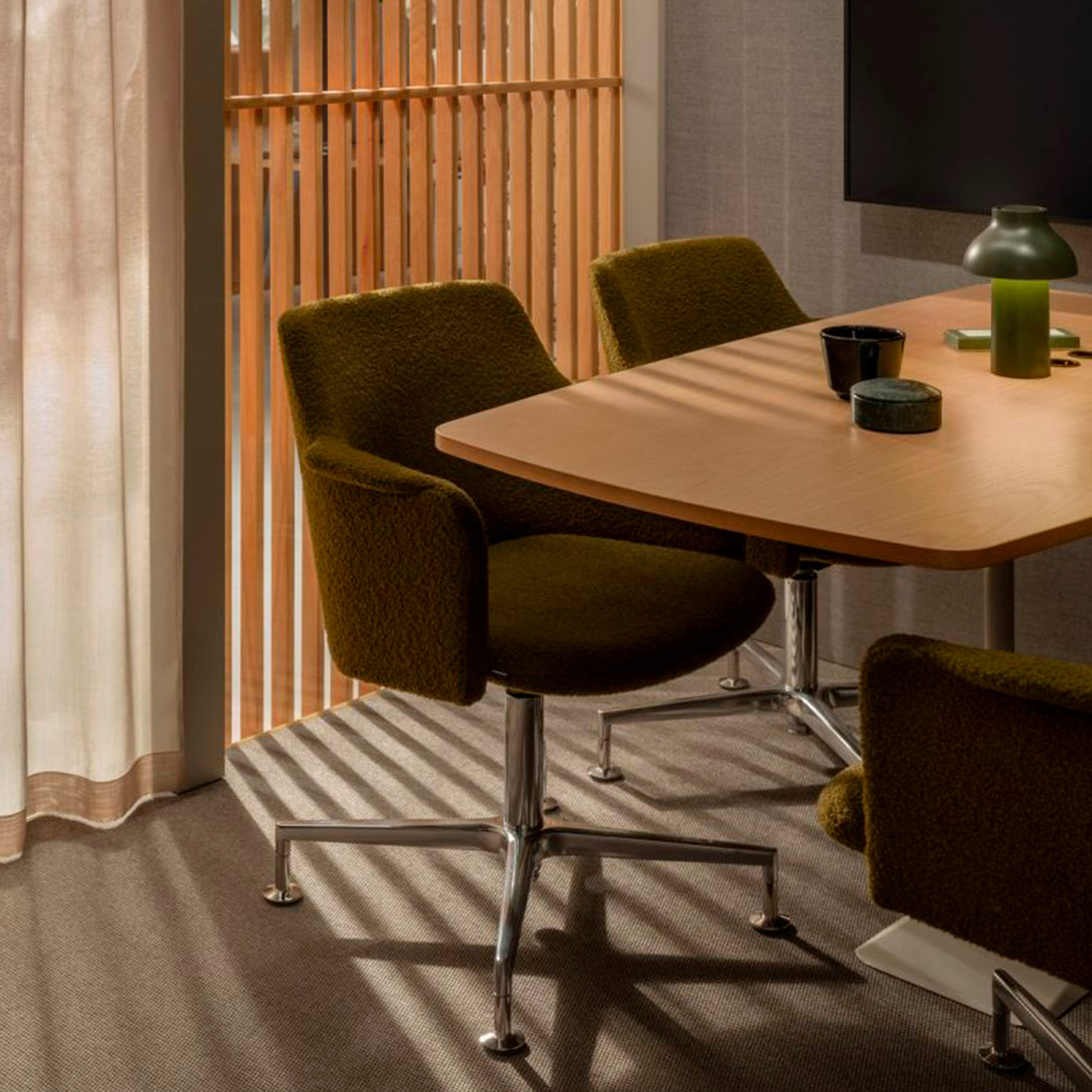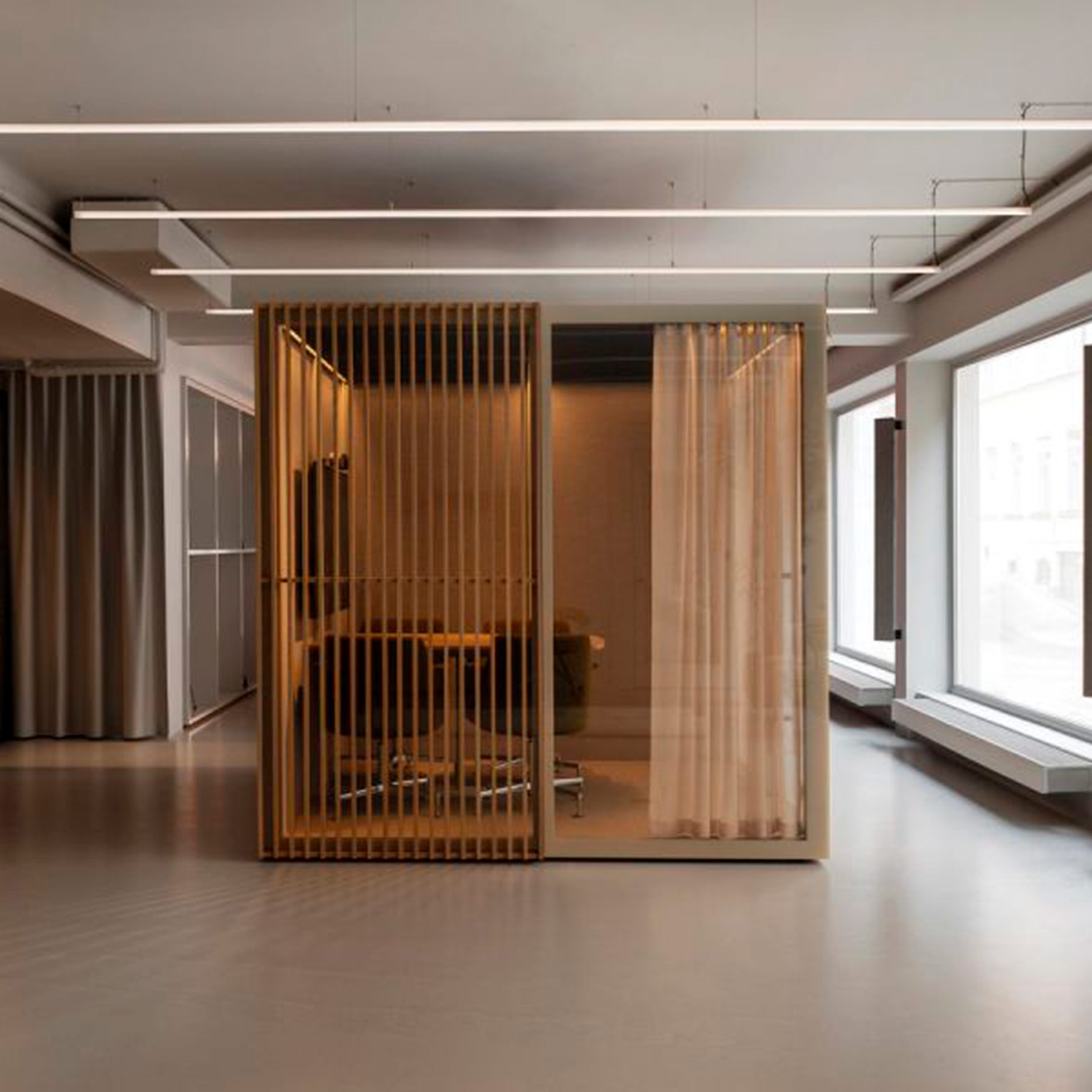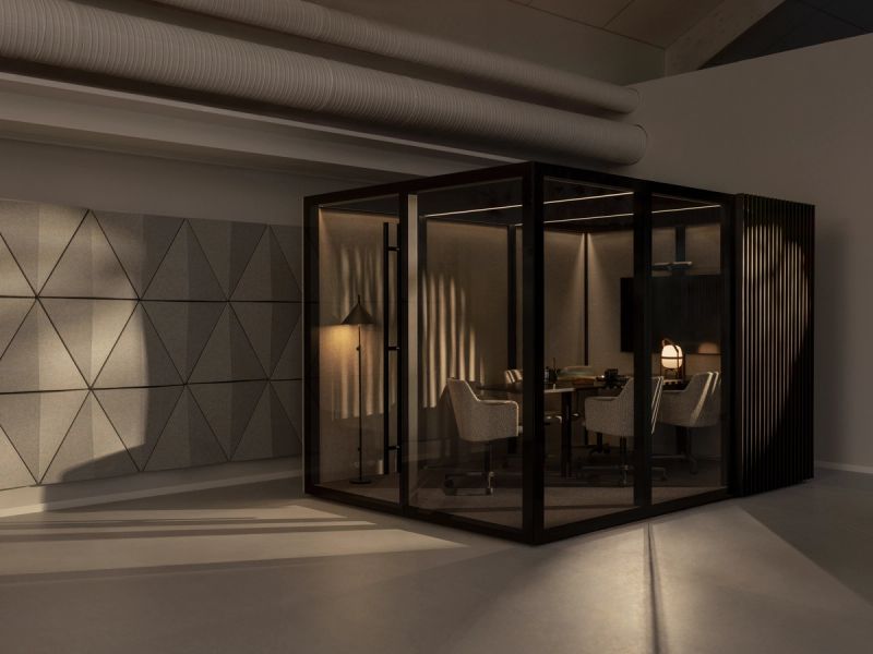 - Kombination af akustikglas og tekstilbeklædte vægge, som reducerer støj både inde i og udenfor podden