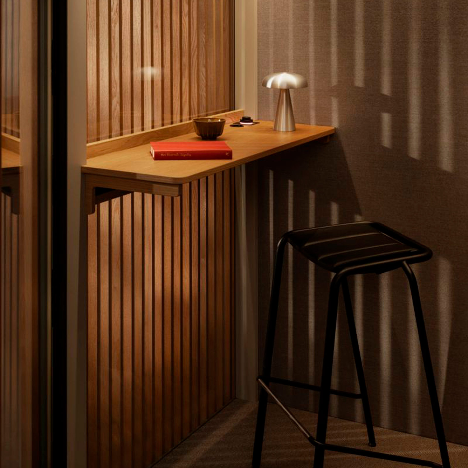 Zen Pod Small leveres som standard med en fast bordplade, hvilket gør den klar til brug som arbejdsstation uden yderligere tilpasning. Der er mulighed for tilvalg af siddepladser som skammel eller kontorstol, afhængigt af behov.